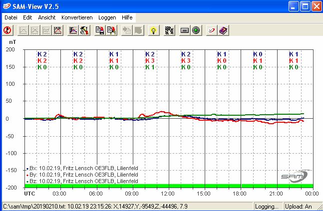 Mein Magnetometer in Lilienfeld ist eines von vielen Amateuren auf der ganzen Welt. Die aktuellen Diagramme sind auf http://www.polarlichtinfo.de/sams.php durch anklicken der Miniaturbilder zu sehen.